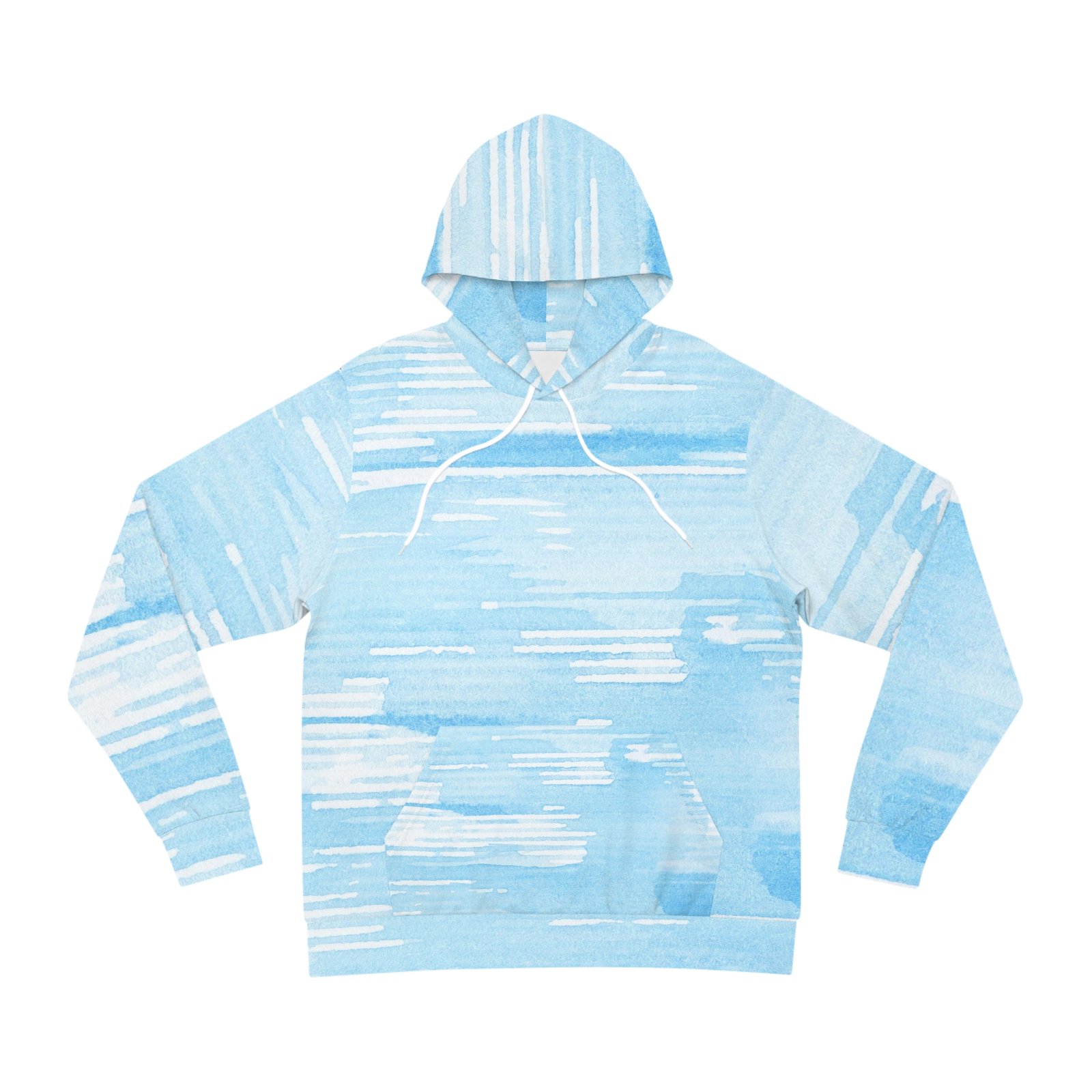 Light blue hoodie with white horizontal stripes pattern, giving off winter vibes. Perfect for staying cozy during colder weather or lounging at home. Ideal for those who enjoy casual, trendy fashion. Relevant for winter holidays and casual occasions.